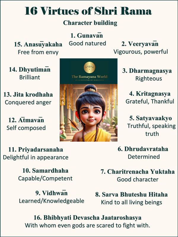 Build your character by the cognizance of the 16 virtues (Kalyana Gunas) of Shri Ram. Learn the in-depth meaning and interpretations of each of these virtues and transcend your life towards enlightment. Click here to learn more.